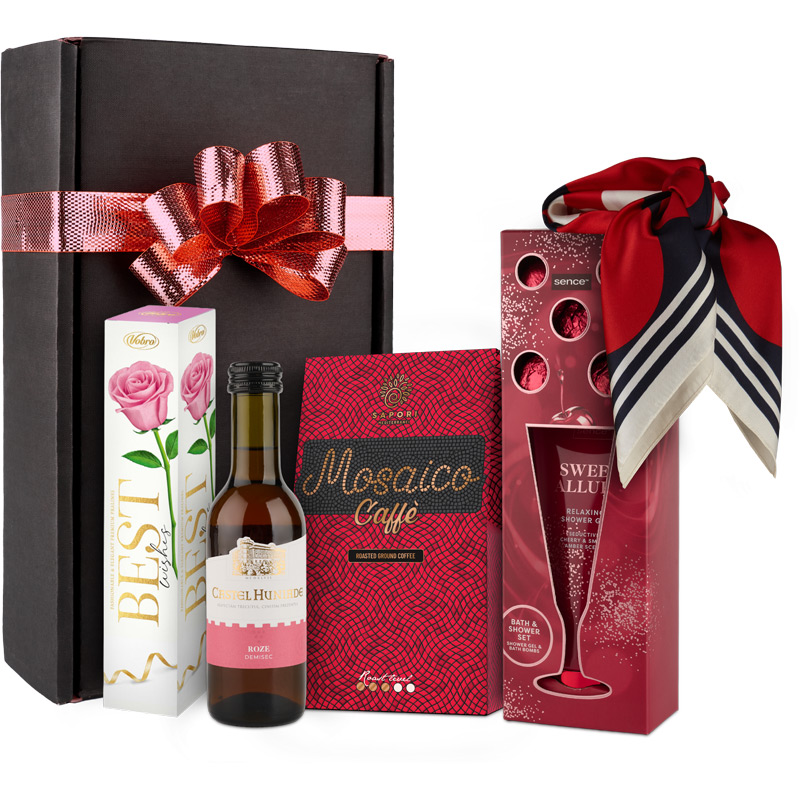 1. Casetă cadou 2 piese, Night luxe sweet allure /2. Eșarfă saten 60*60cm /3. Cafea prăjită și măcinată Caffe Mosaico 100 g /4. Vin rose demisec, Castel Huniade, 18.7cl /5. Paline Best Wishes 75g /6. Cutie cadou